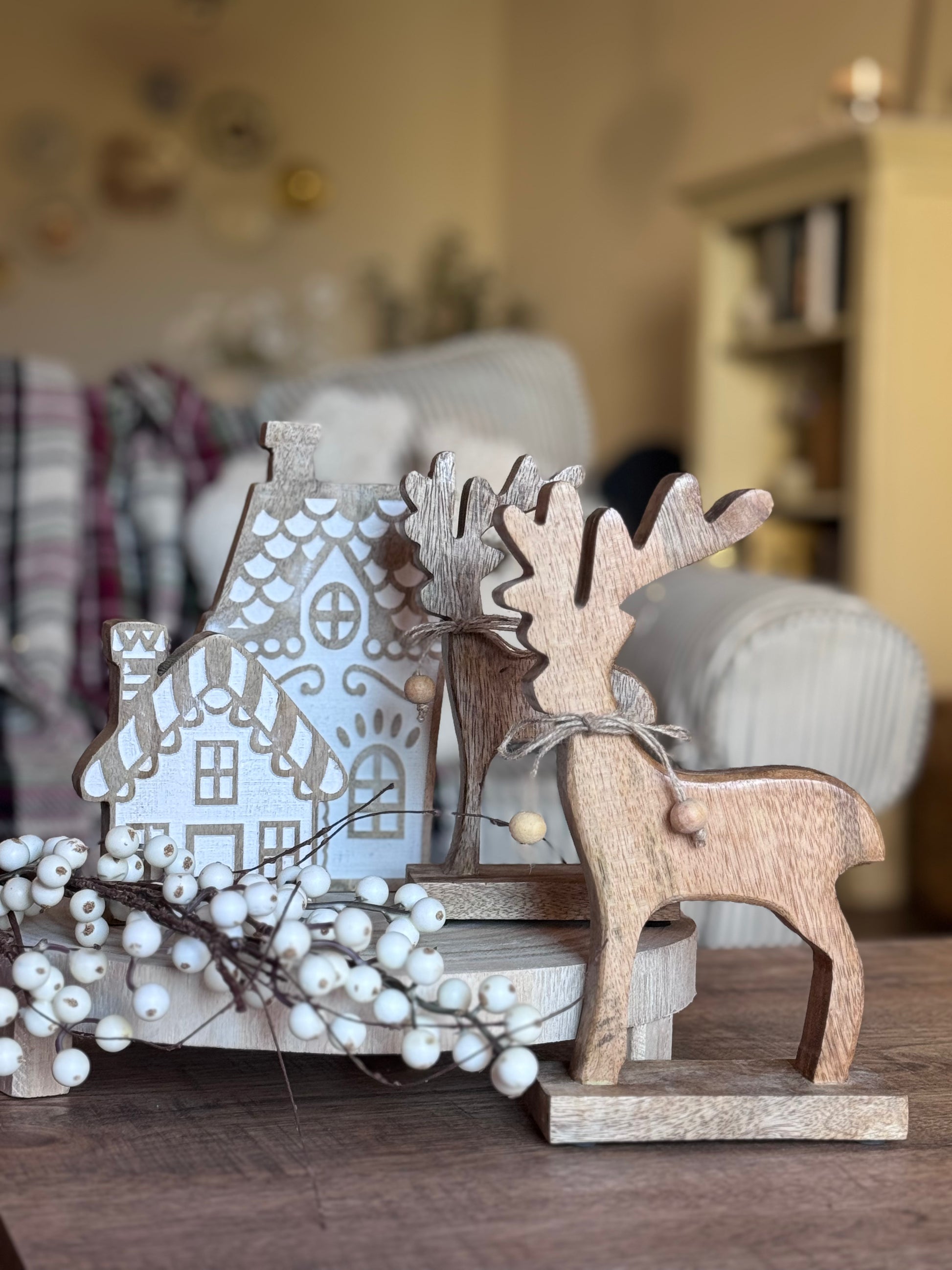 Those dreamy gingerbread houses look like they're straight from a fairy tale winter village, while the natural wood reindeer adds that authentic woodland charm. The frosted snowberry pick brings movement and texture that makes everything feel like you've captured actual winter magic in your home.