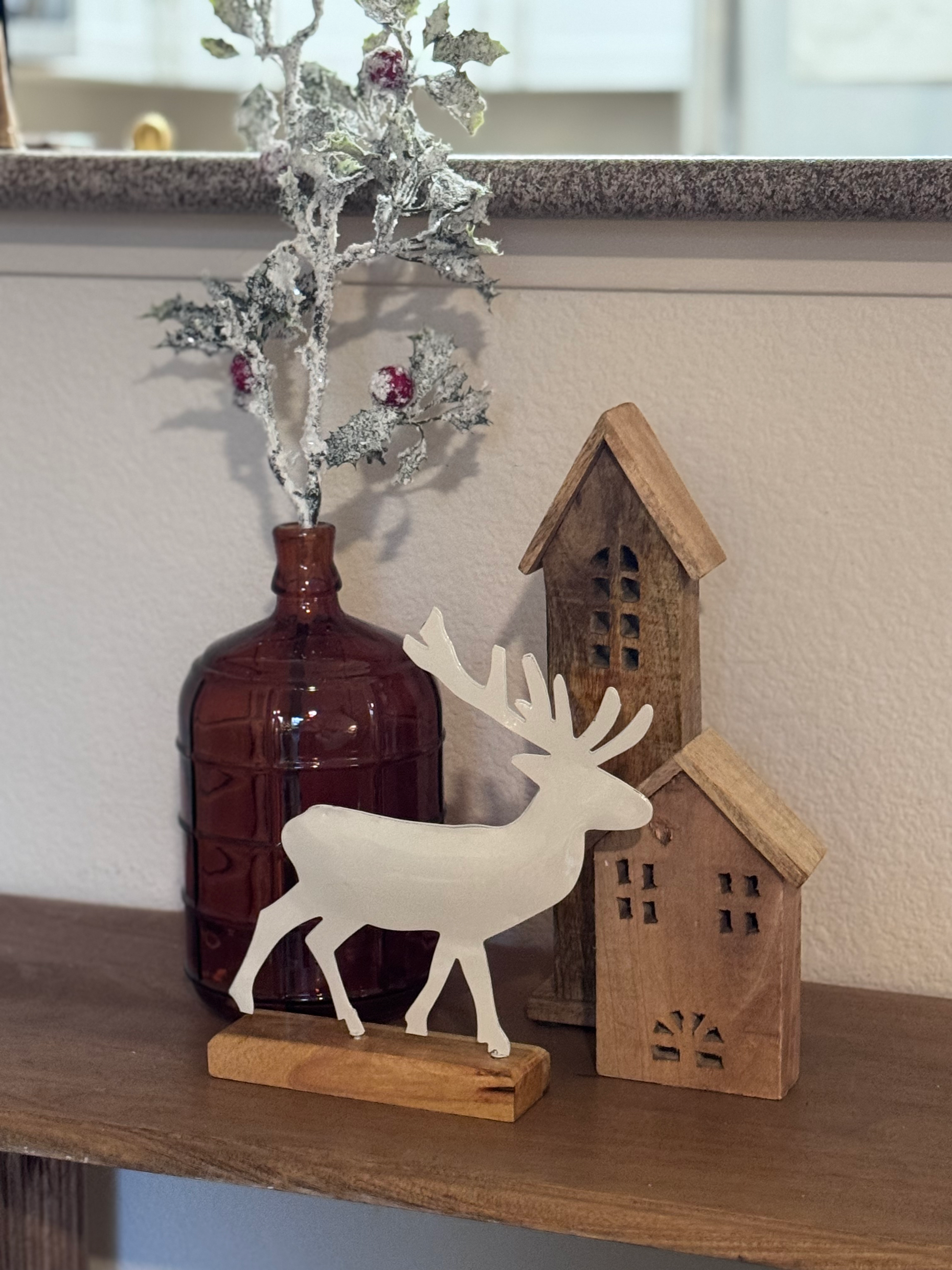 The carved mango wood houses showcase beautiful natural wood grain and hand-carved detailing that makes each one feel unique and special. The rich amber textured bottle adds unexpected sophistication with its warm honeyed glow and gorgeous paneled detail - like liquid gold catching afternoon light through the trees. The metal reindeer sitter brings that perfect woodland presence with its graceful silhouette, while the holly pick adds traditional Christmas greenery with bright red berries. Together, they create scenes that feel both rustic and refined.